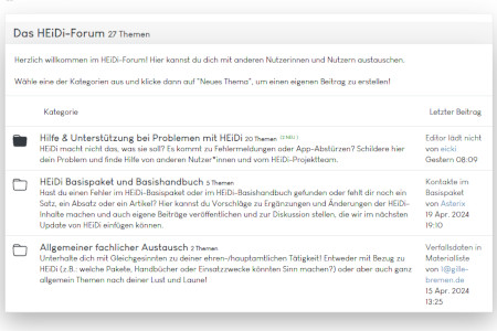 Im HEiDi-Forum kannst du individuelle Fragen stellen und bekommst Antworten vom HEiDi-Team und von anderen Nutzerinnen und Nutzern!